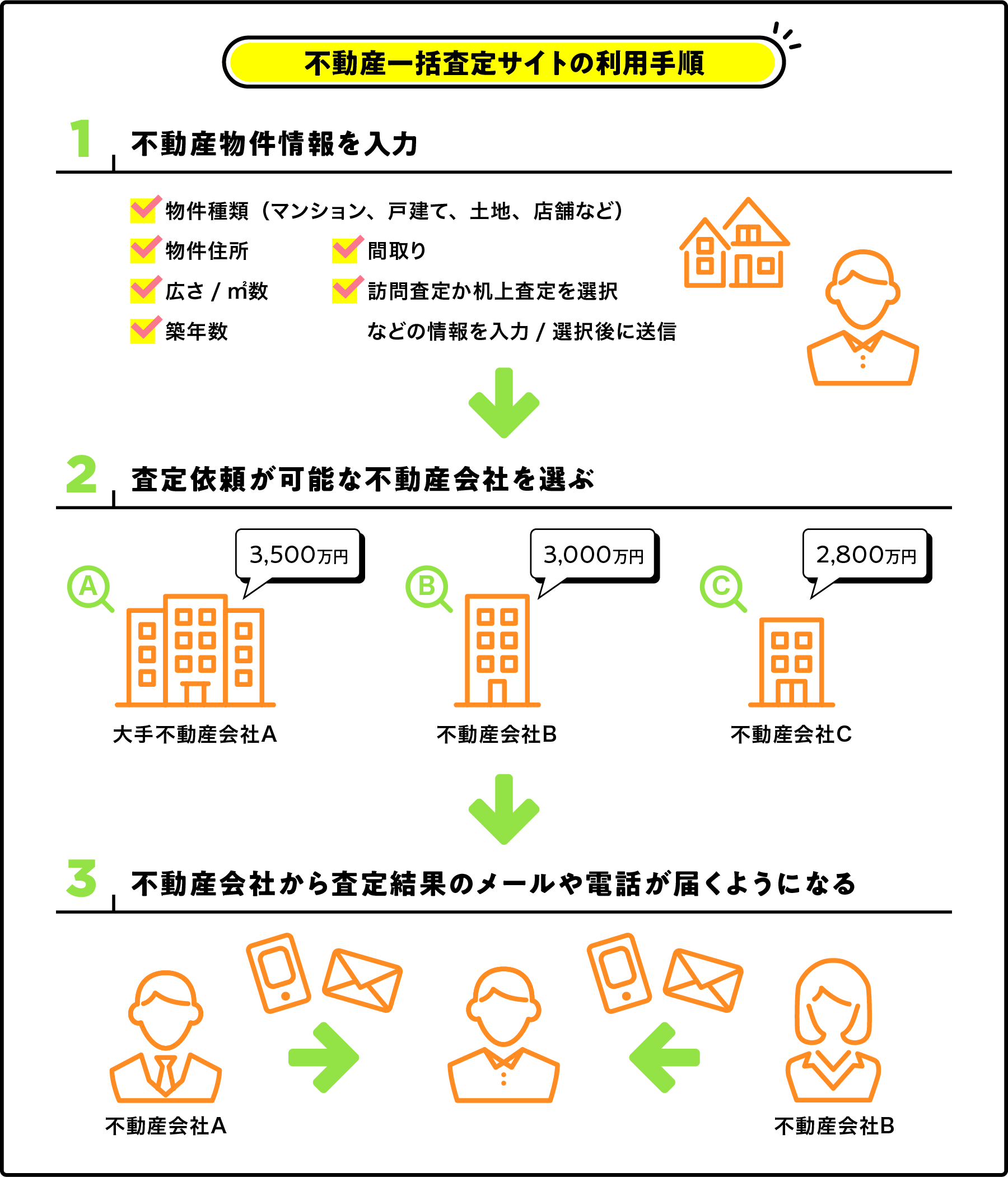 利用者が住所や築年数、購入(取得)した時期などの不動産情報を入力・送信すると、査定条件にマッチした不動産会社に情報が届き、その内容をもとに利用者へ査定結果をフィードバックしてくれます。